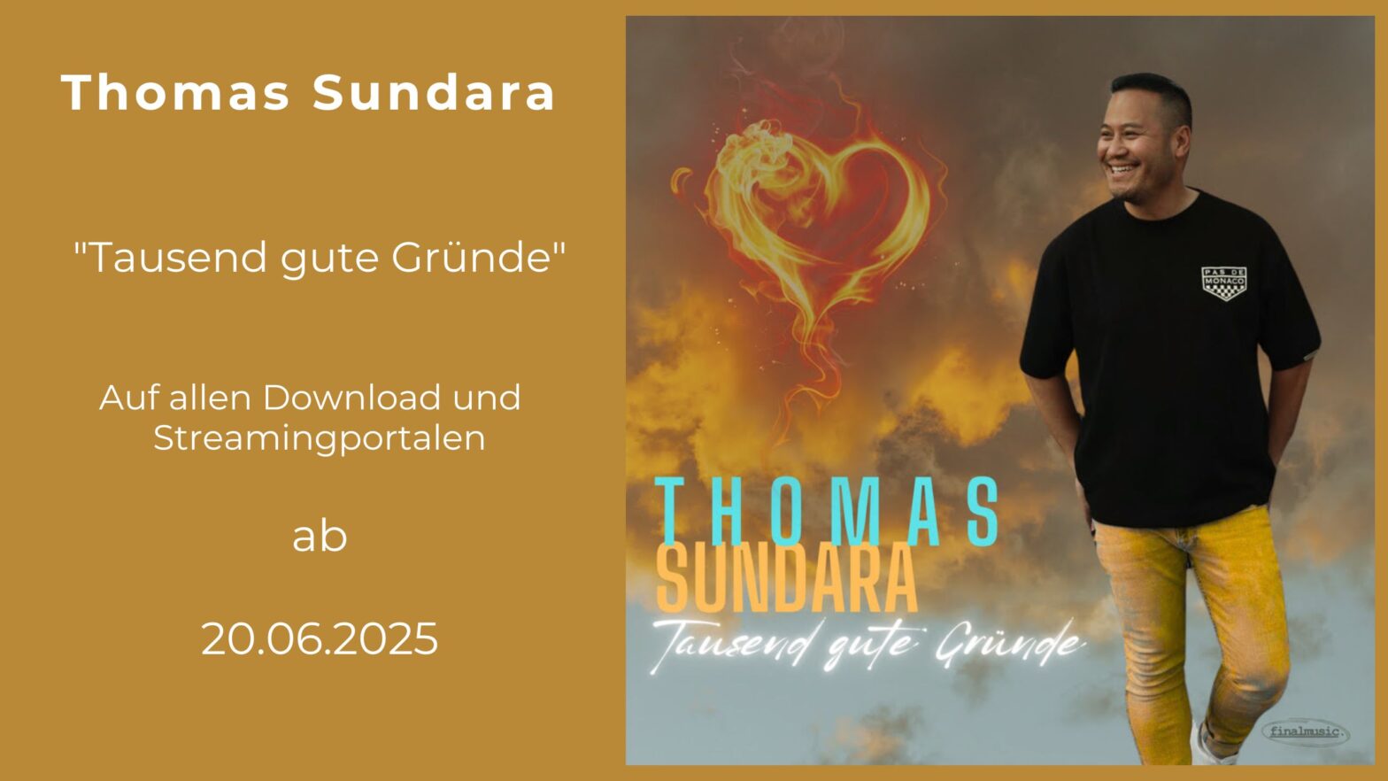 Mit seiner neuen Single „Tausend gute Gründe“ verleiht Thomas Sundara einem der beliebtesten Songs von Andreas Martin frischen Glanz – und liefert zugleich ein berührendes musikalisches Statement. Die Veröffentlichung erfolgt am 20. Juni 2025 auf allen gängigen Download- und Streaming-Plattformen. Eine Hommage mit eigener Handschrift Thomas Sundara gelingt mit seiner Neuinterpretation der Balanceakt zwischen tiefemContinue reading „Thomas Sundara – „Tausend gute Gründe“ Ein Schlager-Klassiker in neuem Gewand – emotional, modern und mit Herz“